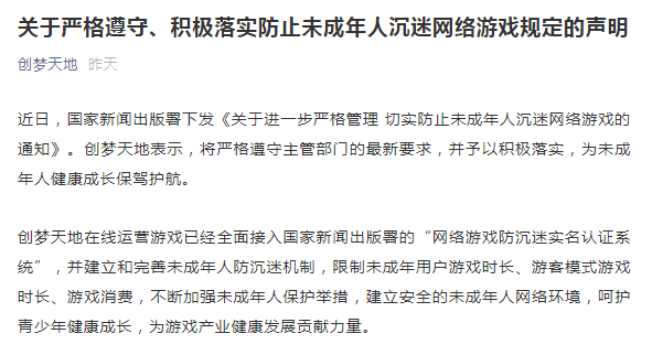 创梦天地:积极落实防止未成年人沉迷网络游戏规定