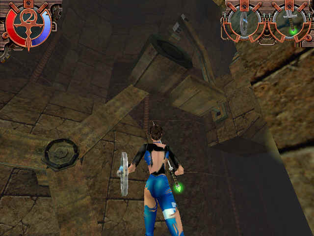 现在,你基本掌握了各种武器装备的使用方法,接下来进去左边的屋子,学习有关攀爬跳跃的技巧。这个游戏并没有特别的键来定义攀爬动作。如果JULIE能够上去的地方,你只要一直按住向前,她会自动爬上去,不必使用跳的动作。不过在攀爬的时候JULIE手中不能拿双手武器。跳跃就更简单了。最后是跳攀。如果碰到比较宽的沟,先向前跳,然后按使用物品键,JULIE就会攀住对面,然后再按向前,她就可以爬上去了。在这间屋子里试一下这些动作的效果。