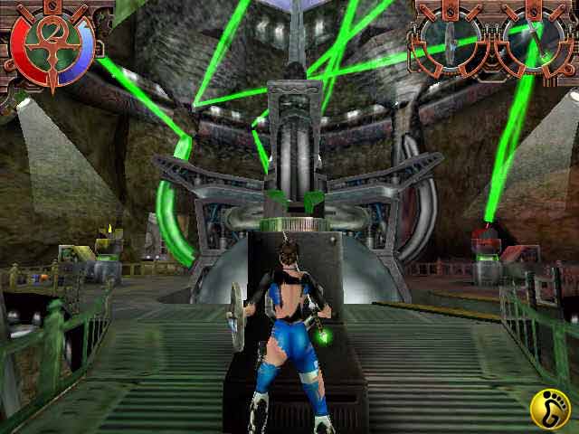 右上方的两个框用来显示你左手和右手所持的武器及弹药状况。在这个游戏里,JULIE被允许双手使用不同的武器,鼠标左键控制左手武器的攻击,鼠标右键控制右手武器的攻击。当然你可以随便用某只手来使用一件武器,不过某些武器是规定你用某只手的,并且一些武器则是必须双手使用的。当你使用双手武器的时候,右上方的两个框会自动合二为一。