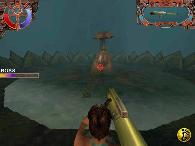 这里的BOSS叫SKYNERPAD,JULIE一跳下船,它就会把你围在中间,主要用闪电攻击。注意先打BOSS主体周围的触角。旁边还有两条龙在攻击你,但是不必理会,尽可能闪开。触角都消灭以后,打BOSS主体的时候,攻击那一块透明的部分(见图PIC09)是不会造成伤害的,所以尽量绕到后面打。打死这个BOSS,JULIE被送到了另外一个地方。