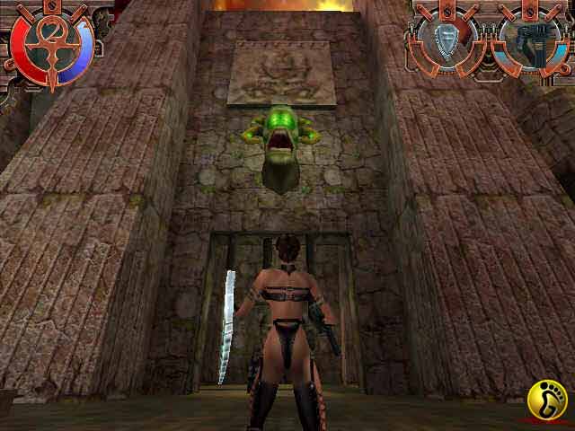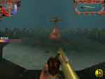 从山洞出来,消灭岸上的敌人之后,跳入小河中,往下游方向走,注意躲开树上垂下来的食人植物和毒气花。从右边的第一块平地爬上右边的石壁,沿着那条窄路往上游方向走,最后在源头附近找到一瓶特殊药水。再回到河里,爬上右边的第二块平地,找到一个红色人头状物品。现在往左边看,可以看到前方左边岸上有一座雕塑。来到雕塑边,放下红色物品,水里的栅栏自动打开了。过了栅栏,又是在右边第二块平地上找到红色人头状物品,再往前,左边又有雕塑,把红色物品摆上去,第二道栅栏打开了。过了第二道栅栏,在左边平地上找到红色人头壮物品,摆到前面的雕塑上,第三道栅栏打开。过了这道栅栏,水流突然变急,JULIE赶紧爬上左边岸上。望下去,这里是一道瀑布,而且有机关封锁着。JULIE纵身跳下深涧。昏迷过去的JULIE被冲上了岸,几只怪兽围了上来。忽然一个怪人出现,念了一道咒语,几只怪兽立即化为肉块。原来这就是GRUFF了。JULIE醒过来,告诉他自己的来意。GRUFF把JULIE送到了神殿并且给了她一只巨型机枪。