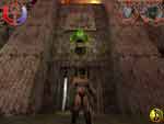 沿着河边向前走,在第二株蘑菇附近有陷阱,一定要小心。走到那附近,陷阱就会启动,别吊下去就是了。从蘑菇翻过去,抓住陷阱上方的绳子。先网上爬一阵,然后跳到左边拿到一个红色人头状物品。跳到陷阱对面,沿着右边走。在一块巨石左边有一棵很大的树,沿着边上的螺旋突起上去。找到第二个红色人头状物品。跳起来抓住上面的铁梯爬到对面,绕到后面,就可以看见第三个了。跳过去把它拿到(小心下边的食人植物)。然后在回到右边河岸。看到河中间有三座雕塑(见图PIC07,当然现在还没有红光)。绕上尽头的巨石,从那植物的叶子跳到河中间有物品的石头上,然后就可以一路跳到雕塑旁边了。走到雕塑附近,JULIE把那三个红色物品依次放在雕塑下边的一个小灰台上。然后雕塑开始显现红光,一个号角出现了,拿到它(每吹一次,就会有一只吸血蜂飞出来保护你)。沿原路跳回来,再到跳去拿第三个红色人头性物品的树上,可以看到右边屋子的顶上有个缺口(见图PIC08)。跳到房顶上,然后再从缺口进去,再跳到下一层,看到墙上有个开关。拉下它,地上就有一道暗门打开,进去找到一些物品和一件奇怪的东西,这时候一阵地动山摇。利用蔓藤从洞口爬出来,等震动过去以后,房门就自动打开了。除了屋子,看到港口那里的房子完全被毁坏了。跳上码头那里的一艘小船,它会带你到BOSS处。
