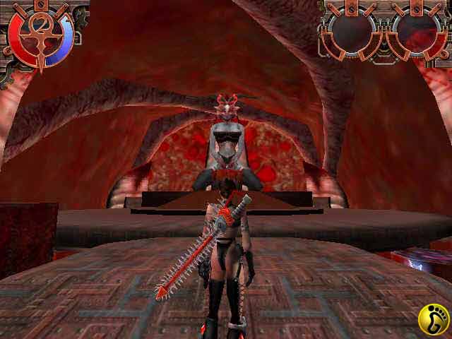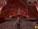 由传送点到了一条红色通道,沿着通道一直向上走,躲开两边的尖刺。消灭路上的机器人,到了尽头,跳进那张大嘴,打开门进去。走到中间狼牙滚轮旁边,先用抛石器在远处射击对面的开关,把门打开。然后再躲过中间的滚轮跑进去。走到尽头,看到对面的红色塑像(见图PIC11)。先把右边远处平台上的机器人干掉。你现在是不可能跳到对面的(不信你存盘试试)。而且你一跳上两边的圆形平台,那平台就开始快速下落。往右边下面看,有两个唱歌的白色小精灵,跟着它们,它们停在哪个平台上,就往哪个平台上跳。就这样跳啊跳,打开了周围的三个开关。当小精灵失踪的时候,你就可以跳上中央平台了。干掉两个SOUL