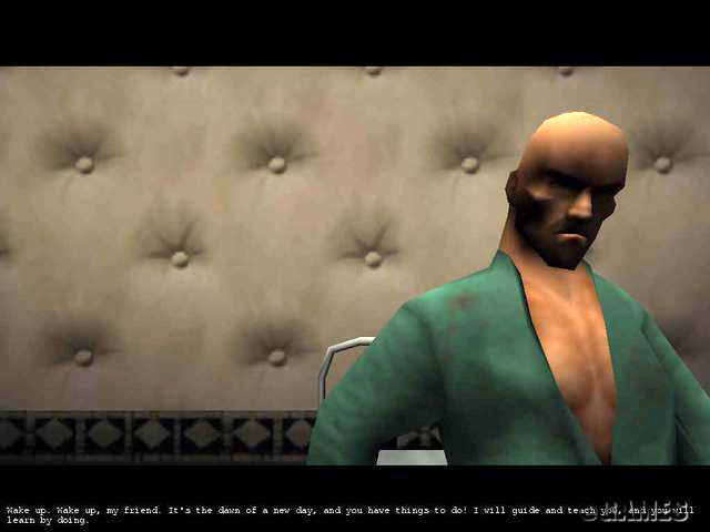 昏昏沉沉之中,47睁开了眼睛,四周全是空荡荡的白墙,'这是在哪啊?','起床了,我的朋友,我会教你一些重要的技能。。。',墙壁中传出一个男人的声音,47从铁床上坐起身来,这时白墙上的一道铁门自动打开了,'来吧,朋友,走出来。。。'在声音的引导下,47走出了自己刚刚苏醒过来的那个房间,进入到外面的房间,这里也是空荡荡的,有一道铁门拦住了去路,47走上前试了试,门打不开,'朋友,你应该先学会换衣服。'声音再次响起,47低下头,在铁门旁的长椅上有一套黑西装,换下身上原来穿的衣服,穿上黑西装,再去开门,这次铁门打开了,走出去是一条走廊,走廊的尽头有一部电梯,但电梯好象打不开,47走回刚出来房间的对门,这里的门可以打开,47走了进去,这是一个大房间,房间里架了很多的高台,“我该怎么做了?”“朋友,爬上去。。。”那个声音又响起来了,顺木梯爬上高台,沿着曲折的高台前进了一段后,路没有了,高台的另一端与这一端断开了一段长长的距离,“也许我应该跳过去。”47高高跃起,顺利来到了高台的另外一边,“非常不错!”那个声音称赞道。从高台上下来,47打开了出口处的铁门,回到了走廊上,来到电梯口,电梯门自动打开了,47走了进去,电梯向下一层开去。
