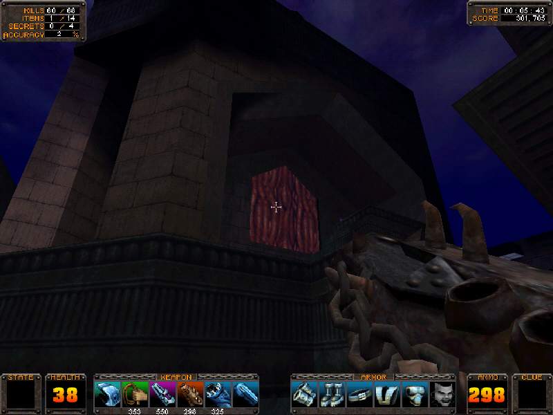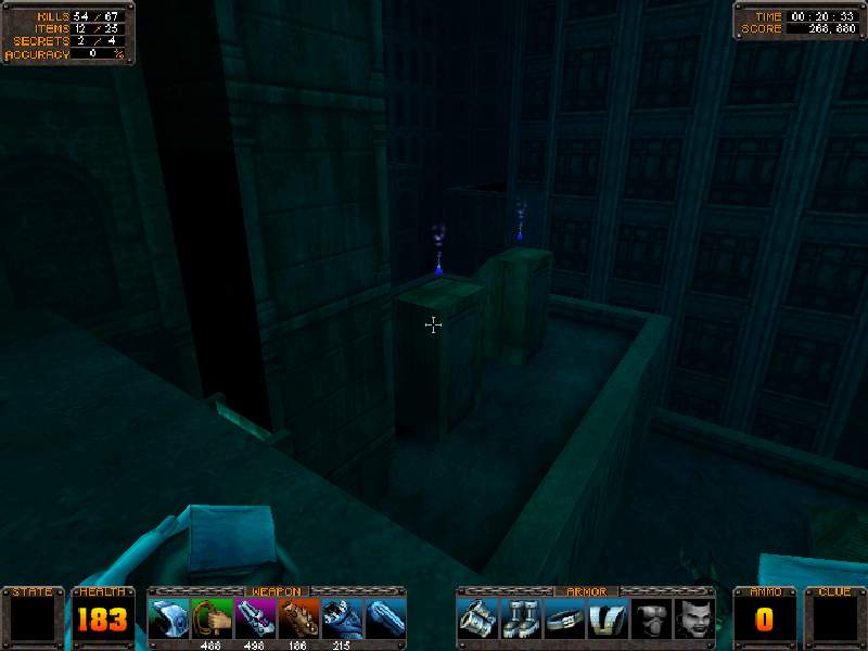 出了这个通道,来到一个摆满箱子的广场,这时候会有一大群各种怪物冲上来,把它们全消灭。现在箱子周围(包括箱子上面)仔细搜索,找到很多物品。然后从门旁边的楼梯上去,走到尽头转动水泵,会发现刚才跳下来的那个地方有个门开了。回到那个门前面,进去,看到里面有很多平台。当你开始跳到对面第一个平台上的时候,底下的有毒紫色液体开始向上涌,快速利用平台跳到上面去。走过最后的通道,沿旁边的楼梯一直向上,就找到了传送镜子。在上楼梯的时候,可以看到旁边的拱形洞,总共三个,都是秘密地点。通过传送镜子,就到了CATHEDRAL。