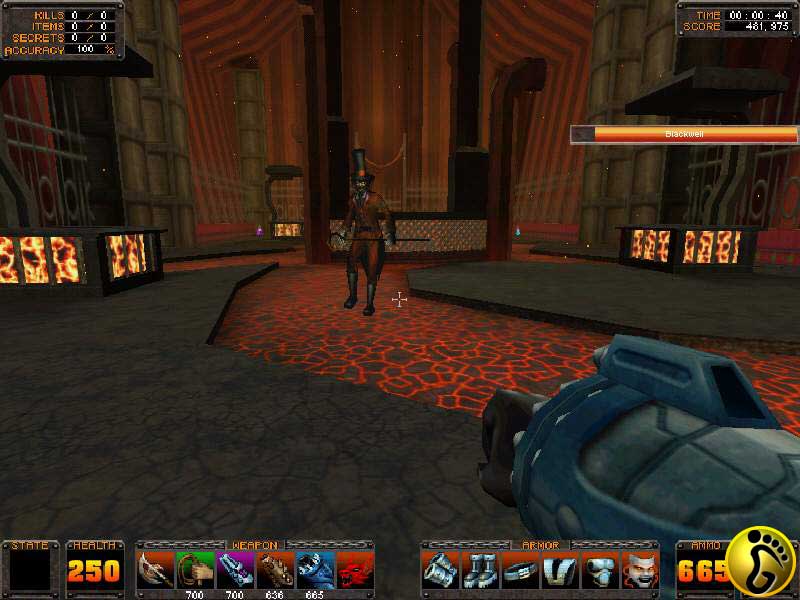 进去以后,先在靠右的小亭子里拿到3号枪,然后沿着走边的通道走,在尽头拿到钥匙。回到门右边,先打开左边的铁门,拿到弹药,然后用钥匙打开右边的门。电梯把你送到下面,一出来,一个双手拍火的家伙就冲了过来。来到外边,先尽快用5号枪把头顶铁梁上的四个传送窝都打掉,否则你很快就要陷入无休止的战斗。走到尽头,沿着铁梁爬上去。再往上爬一层,沿着细铁棍走到对面,在右边的房子里找到传送镜子。要小心,这个区域有大量小BOSS,很多是扔回旋飞镖的,尽量在远处干掉它们。穿过镜子,来到POISON