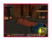 先回头,把背后高墙上的那个双手扔飞镖的家伙干掉,然后贴着左边的铁丝网走,来到一个门口,看到这里竟然是ROCK CITY核电站。进了核电站大门,先干掉左边塔上的那个火炮怪人,然后沿着路一直向前。在左边有一间屋子,打开门进去拉下墙上的开关,这时候,途中的一个吊桥放下来了。回到吊桥,走过去到了一个隧道。