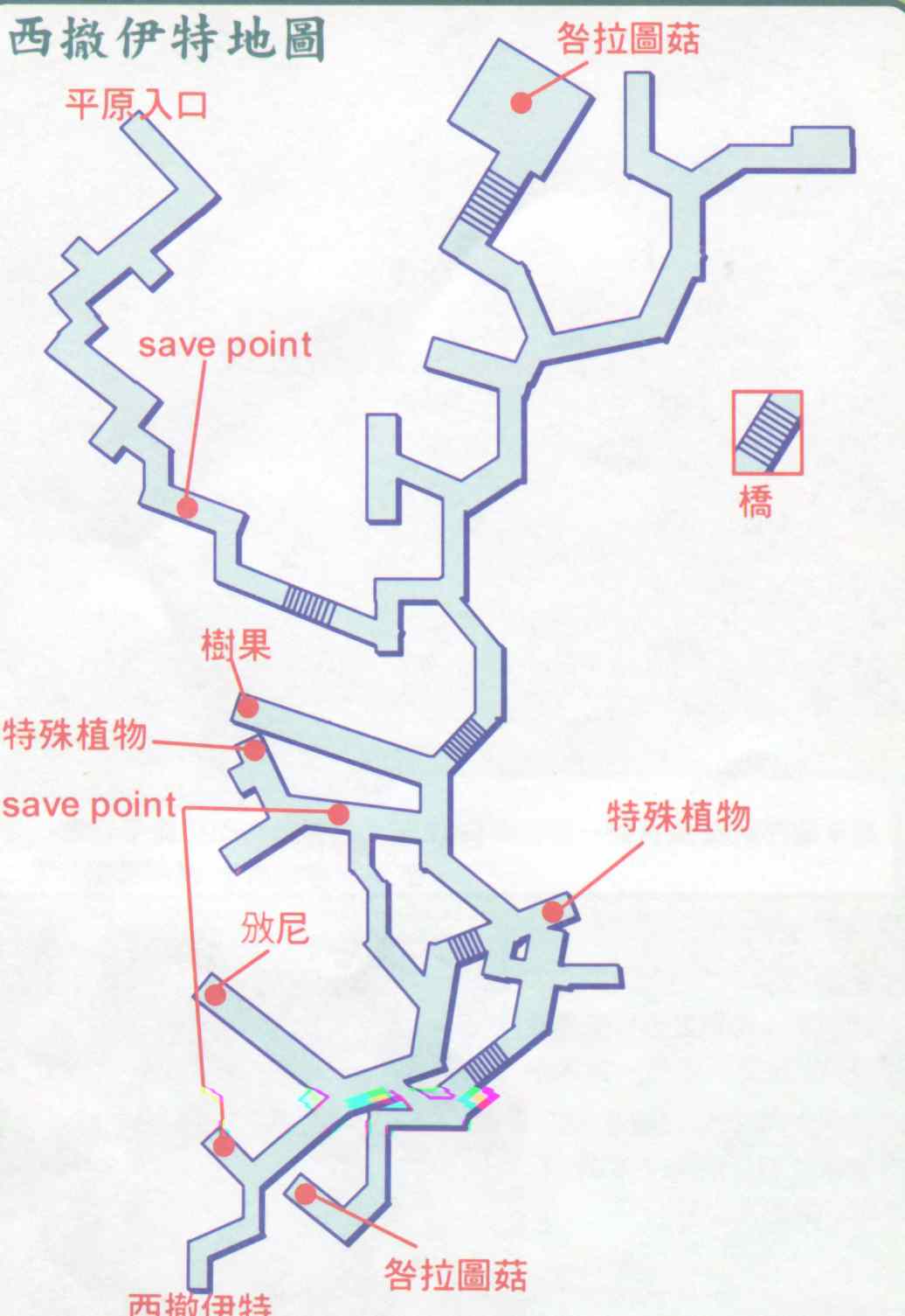 别要小看这条矿坑,内里的怪物如普伍、泥派绝非泛泛之辈,一个不留神,你随时会命丧黄泉。迪恩哥可算是这矿坑里最强的生物,其攻击每次可扣玩家们30-40生命值。在每次战斗时,玩家们最好先察看自己的状态,如有什么异样包括中毒、体力值(HP)低等,便应立即使用药草治疗。必杀技是需要一定的FP值,你最好先衡量当时的情况及怪物的等级而使出,否则在旅途中将会陷于苦战。虽然旋劈所需的FP只是4,但其攻击力也不赖,可算是最实用的必杀技。