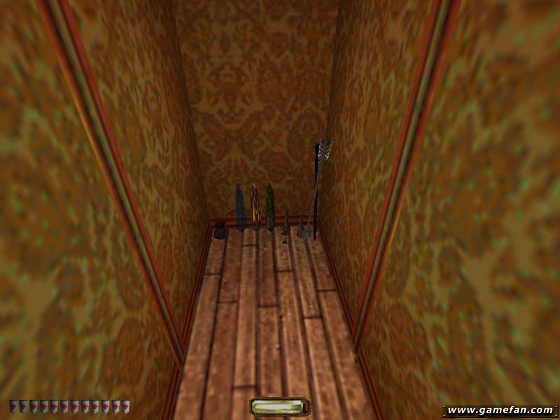 走进银行后,玩家先到前方的门吧!因为这里才是通往HALL OF RECORD的通路,而左方的门是通往VAULT的大家一定要记着池!当走进第一度门后,大家先把墙上的油灯熄掉吧!因为前方有一部守卫机器人把守,跟着再利用两去火箭便能把机器守卫K.O(谨记瞄准时要向低一点瞄准因为火箭是向上走的。)玩家最好一拼把拿着弓箭的守卫解决,这便不用浪费自己的弓箭啊!