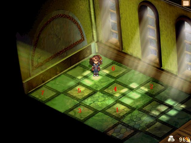 你只要按它所列条件写一个方程式就可以算出来了,答案是84。答对后可从教堂大厅那两副壁画里找到一些东西。