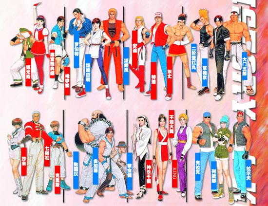 ADVANCED MODE 以“KOF’96”为基础,可使用紧急回避和摔技摆脱等。能量条在主角击中敌人、被攻击以及使出必杀技时会增加,达到最大(MAX)时会积攒为一格,通过此格可以使出各种超必杀技和各种防守反击技等。跳跃在本作中也分为大、中、小三种,另外连续两次按向前方向可以快速前冲。 EXTRA MODE是以“KOF’94~95”为基本,包括攻击回避和能量条积攒。没有前冲功能,只有STEP和JUMP,另外跳跃也只有大跳一种。选择哪种模式进行游戏玩家凭喜好选择。 除此两种模式外,象空中攻击,防守反击,空中防守和蹲闪避等功能仍存在。 《KOF97》全部登场人物及BOSS介绍