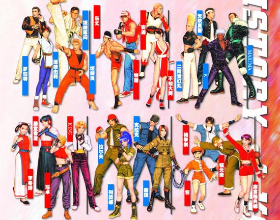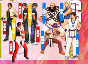 在“KOF 99”下选择四人组队,一个人作为后备的系统。在战斗中通过消费画面下方的STRIK BOMB呼出后备人物负责援护攻击。另外,在呼出后一定时间内主角的下半身处于无敌状态(无敌范围根据主角不同而有差异)。 呼出攻击时,敌人的攻击无效。对使用一方来说是十分有利的战法,而且援护攻击威力较大。 在能量格三格全满时,有通过设定键全部消费的可能,在一定时间内可随意使用超必杀技,熟练使用对战斗十分有利。 《KOF97》全部登场人物及BOSS介绍