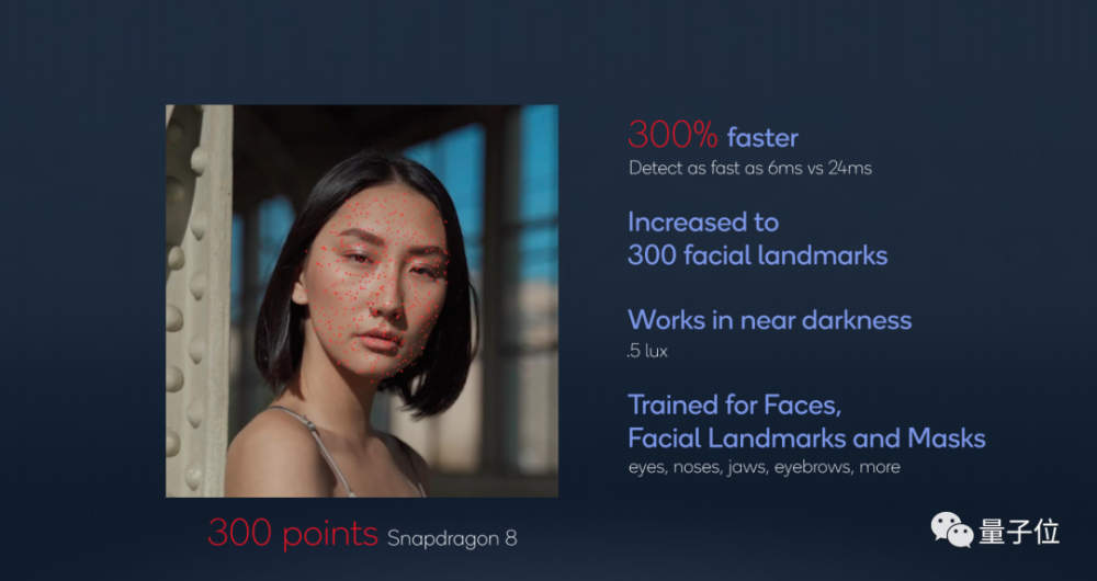 在此之上辅以人脸识别算法,骁龙8将面部特征识别点增加到300个,能够捕捉到更为细微的表情变化,同时人脸检测速度也提升了300%。