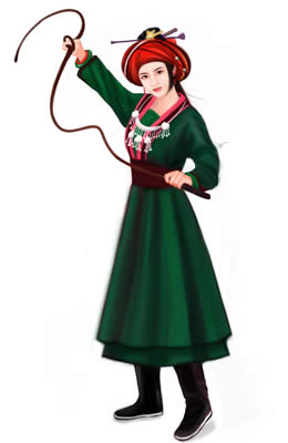 云南苗族美女,喜爱花花绿绿的装扮一如其名。她擅使蛊,使毒,全身上下都有毒物,令人退避三舍。因日月神教圣姑任盈盈之故,以一教之尊不惜以自身鲜血为令狐冲疗伤。为人爽朗,落落大方,堪称女中英豪。但因任盈盈之故,虽对令狐冲有好感,只与其以兄妹相称。
