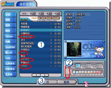 | 1.歌曲栏,可选择要弹奏的歌曲,也可以设定为4个难度档次的随机选曲。若歌名显示为蓝色,则为未下载和购买的歌曲,需要去“音乐商店”进行购买后才可弹奏。