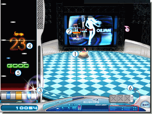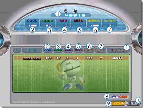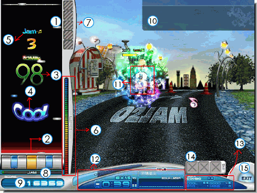 7. 药丸栏。在游戏进行中,玩家可以通过连击得到药丸,最多可以得到 5 个。当拥有药丸时,系统会自动把玩家打出的一个 Bad 换成一个 Cool ,并保持连击不中断。每抵消一个 Bad 扣除一个药丸。具体药丸得到公式如下:连续击打 15 个 Cool 就能获得一个药丸。中间不能出现 Good , Bad , Miss 。