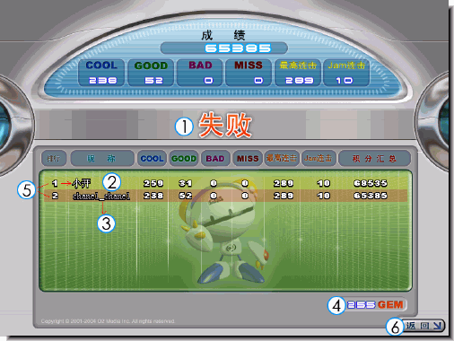 | 在单独游戏时,最后得分的说明:1. 在玩家体力全部用尽后,此时,玩家的游戏人物形象变成欧姆,此次游戏任务失败。但玩家仍可继续游戏。